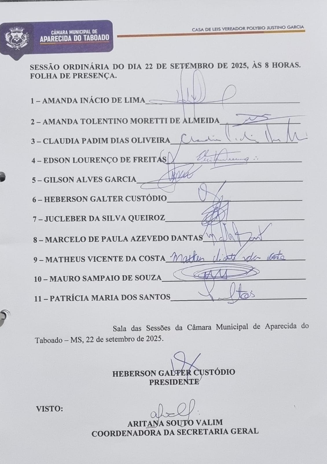 LISTA DE PRESENÇA DA SESSÃO ORDINÁRIA DO DIA 22 DE SETEMBRO DE 2025, ÀS 08 HORAS (MS).