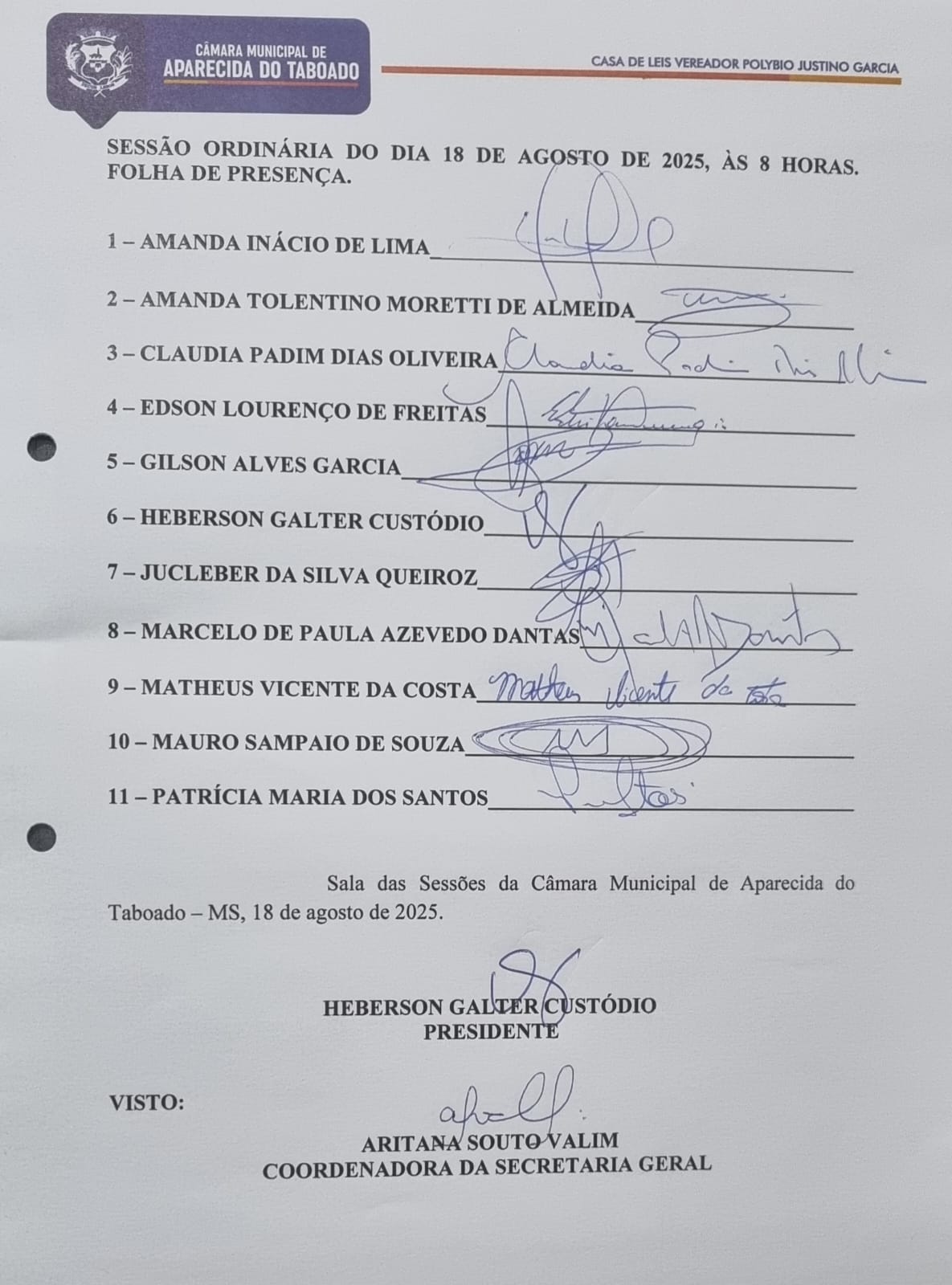 LISTA DE PRESENÇA DA SESSÃO ORDINÁRIA DO DIA 18 DE AGOSTO DE 2025, ÀS 08 HORAS (MS).